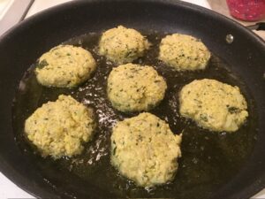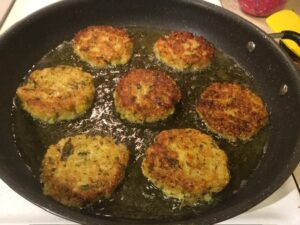 • Heat up 1/4” deep of vegetable oil in a large sauté pan over medium heat. Add the patties into the pan, making sure to not overcrowd.