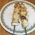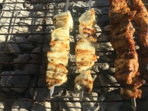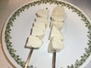 - Cut the halloumi into 1 1/2” cubes. Pat dry with paper towels. Place on metal skewers and brush with olive oil.