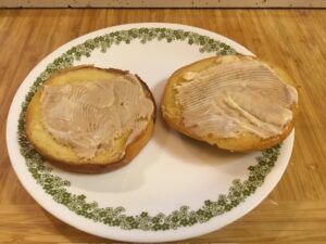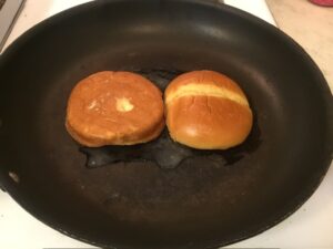 - Melt the butter in a skillet over medium heat. Slice the roll in half and toast until browned; about 2 minutes max. Remove from the pan.