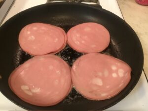 - Add 4 stacks of 3 slices of mortadella. Cook until crispy; about 3 minutes.