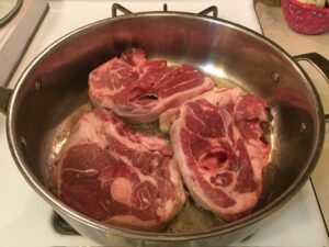 - Season the lamb shoulder chops with salt on both sides. Heat up the olive oil in a large saucepan over medium high heat. Add in the lamb chops.