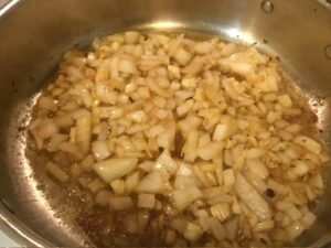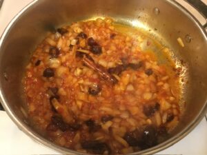 - Turn the heat to medium. Add in the onion, garlic, harissa, and cinnamon stick. Sauté for 2 minutes.