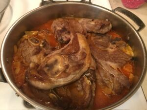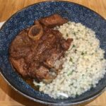 This Tunisian lamb shoulder is fall off the bone tender. The lamb is braised in a spicy harissa based sauce with a slight sweetness from the fruit chutney and dates. You can use boneless lamb shoulder or leg if you can’t find bone-in shoulder; but bone-in is always the way to go. Serve the harissa lamb with a side of Israeli couscous to soak up the sauce.