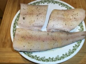 • Pat dry the black cod with paper towels. Season with salt, garlic powder, and pepper.