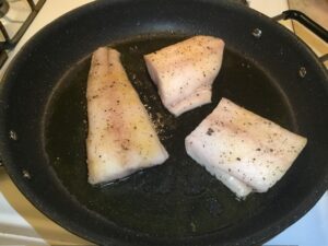 • Heat olive oil in a sauté pan over medium high heat. Place the black cod skin-side down. Cook for 5 minutes.