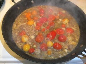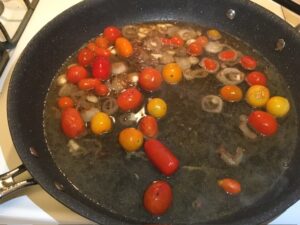 • Turn the heat to medium. Sauté the tomatoes and shallots for 5 minutes.