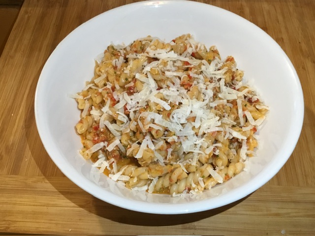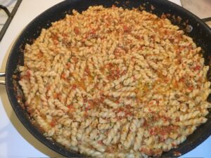 Red Pesto sauce is a Sicilian variation of the traditional basil pesto, but using cherry tomatoes, almonds, and pecorino romano instead of pine nuts and parmesan. This sauce is raw and doesn’t get cooked other than being lightly heated from the hot pasta; giving it a fresh taste. Using a curly shaped pasta works best for catching the sauce.