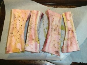 - Line a baking sheet with parchment paper. Place the bone marrow canoes on; drizzling with olive oil. Season with salt and pepper. Roast in a preheated 350° oven for 15 minutes.