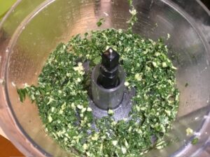 - While the bones are roasting, place the parsley, anchovy fillets, and garlic in a food processor and pulse until everything is evenly chopped.