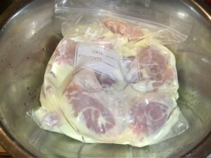 • Place the chicken in a gallon sized ziplock bag. Pour in the pickle brine/buttermilk. Marinate in the refrigerator for at least 12 hours; preferably overnight.