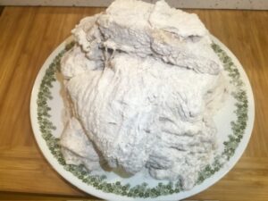 • Dredge the chicken in the flour, the remaining buttermilk, and then back into the flour. Shake off the excess flour.