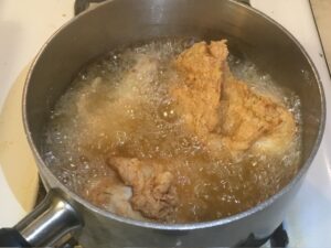 • Fill up a large pot with 3” of vegetable oil. Heat until the temperature reaches 350°. Fry the chicken in batches.