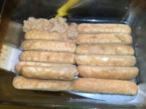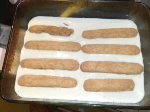 • Line a 9×5 glass dish with a dozen of the soaked ladyfingers.